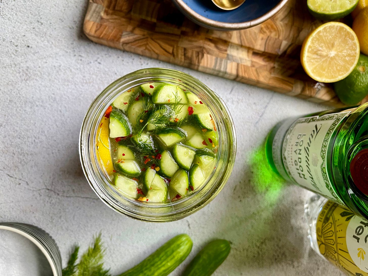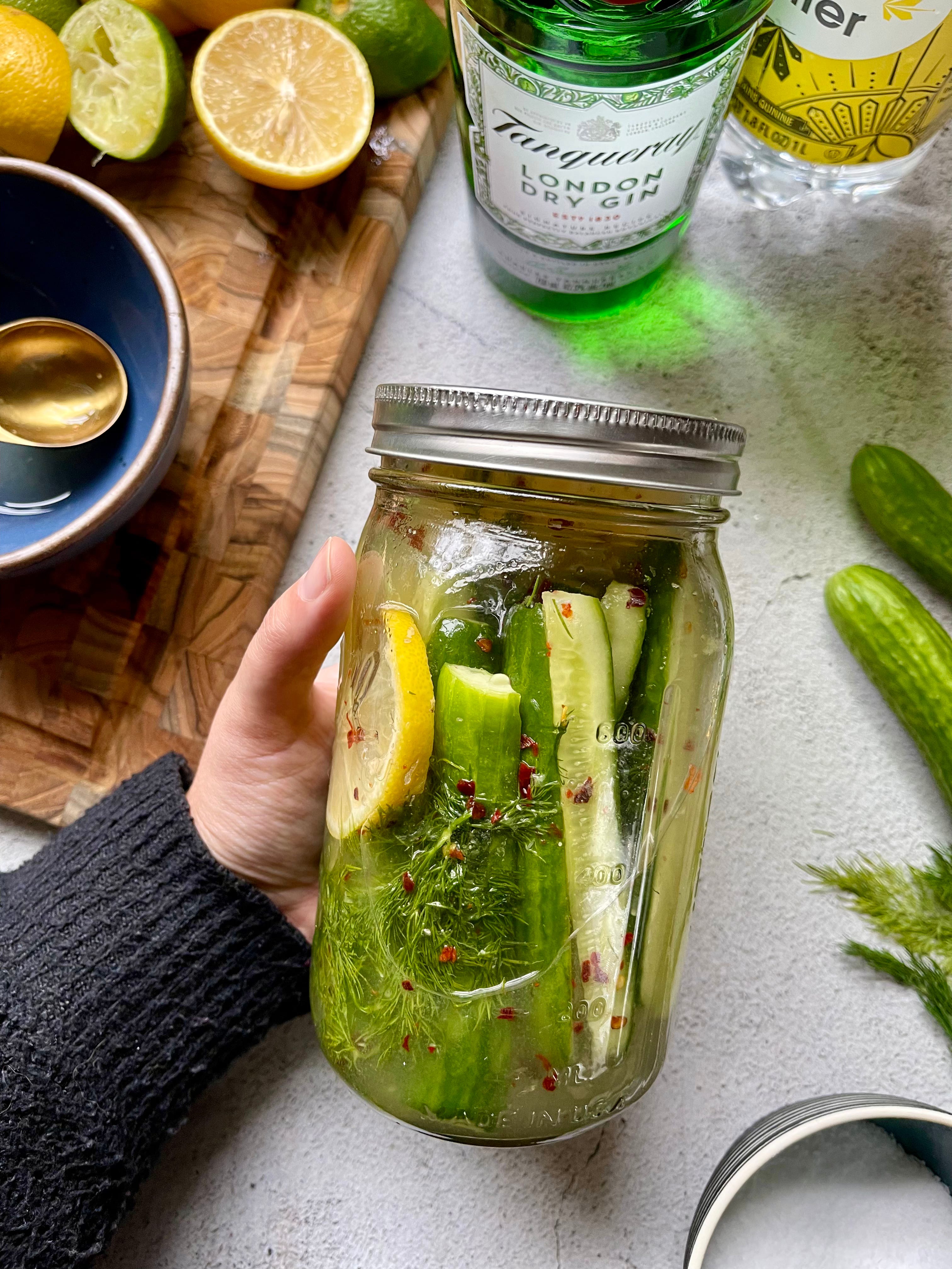 Lightly roll the mason jar over the sprigs of dill to release that dilly goodness. Plop the dill and red pepper flakes into the bottom of the jar. Pack the quartered cucumbers into the jar and tuck the lemon and lime slices in as well. Add your lemon juice, lime juice, sugar, and salt. Top with a lid and shake until most of the sugar and salt has dissolved. Pour in fresh tonic water until the cucumbers are completely submerged. Put the lid back on, and place in the fridge for at least 24 hours. These beauties will last 4 weeks in the fridge, pop one out to garnish your next G&T or bloody mary. You can also stir in one tablespoon of the pickling liquid if you want even more of that delicious flavor. Cheers!